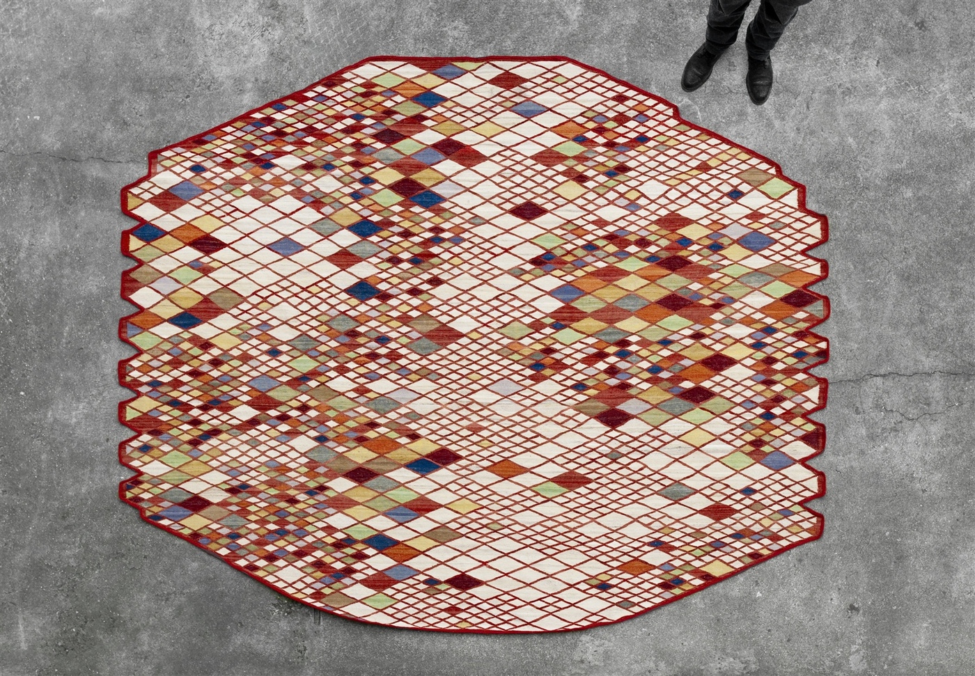 Alfombra de gran calidad, fabricada a mano, con técnica Hand women con lana Algana 100% hilada a mano. Densidad 156000 nudos por m/ 2, altura del pelo 4 mm. Grosor total máxima de la alfombra 4 mm. Peso 1,4 kg/m2