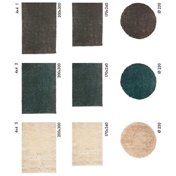Alfombra de gran calidad, fabricada por el sistema Hand Loomed, con fibra 100 % de poliester reciclado. Densidad 15500 nudos por m/ 2, altura del pelo 30 mm. Grosor total de la alfombra 35 mm. Peso 3 kg/m2