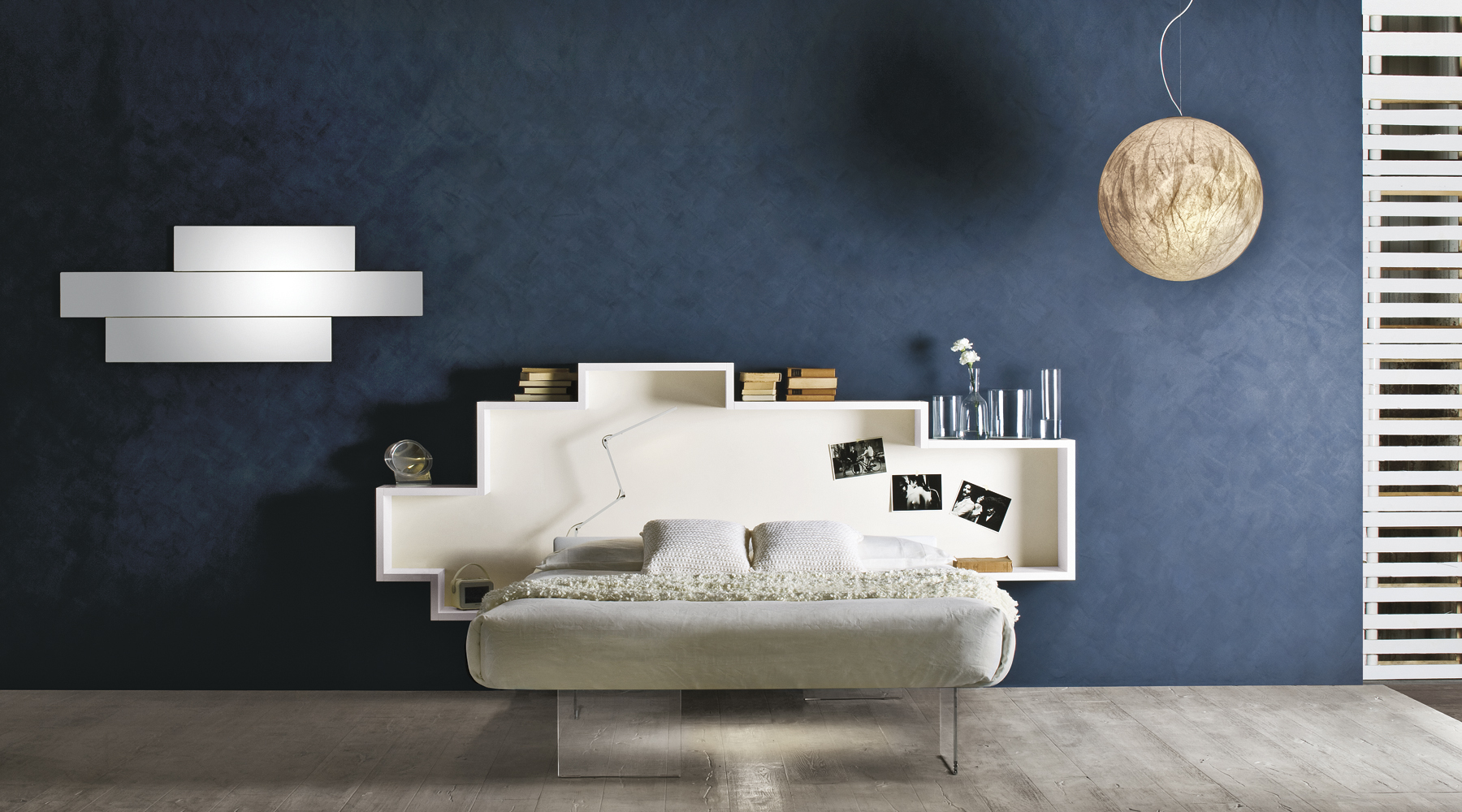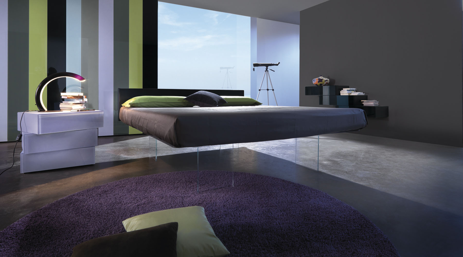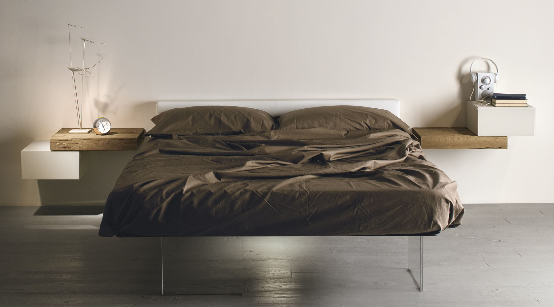 Air es una cama flotante, etérea, sexy. La plataforma de la cama está suspendida sobre cuatro losas de cristal casi invisibles que dan una sensación de gran ligereza. Gracias a la absoluta transparencia del vidrio templado extraclaro de apoyo, la cama parece levitar y es como dormir encima de una nube.