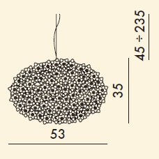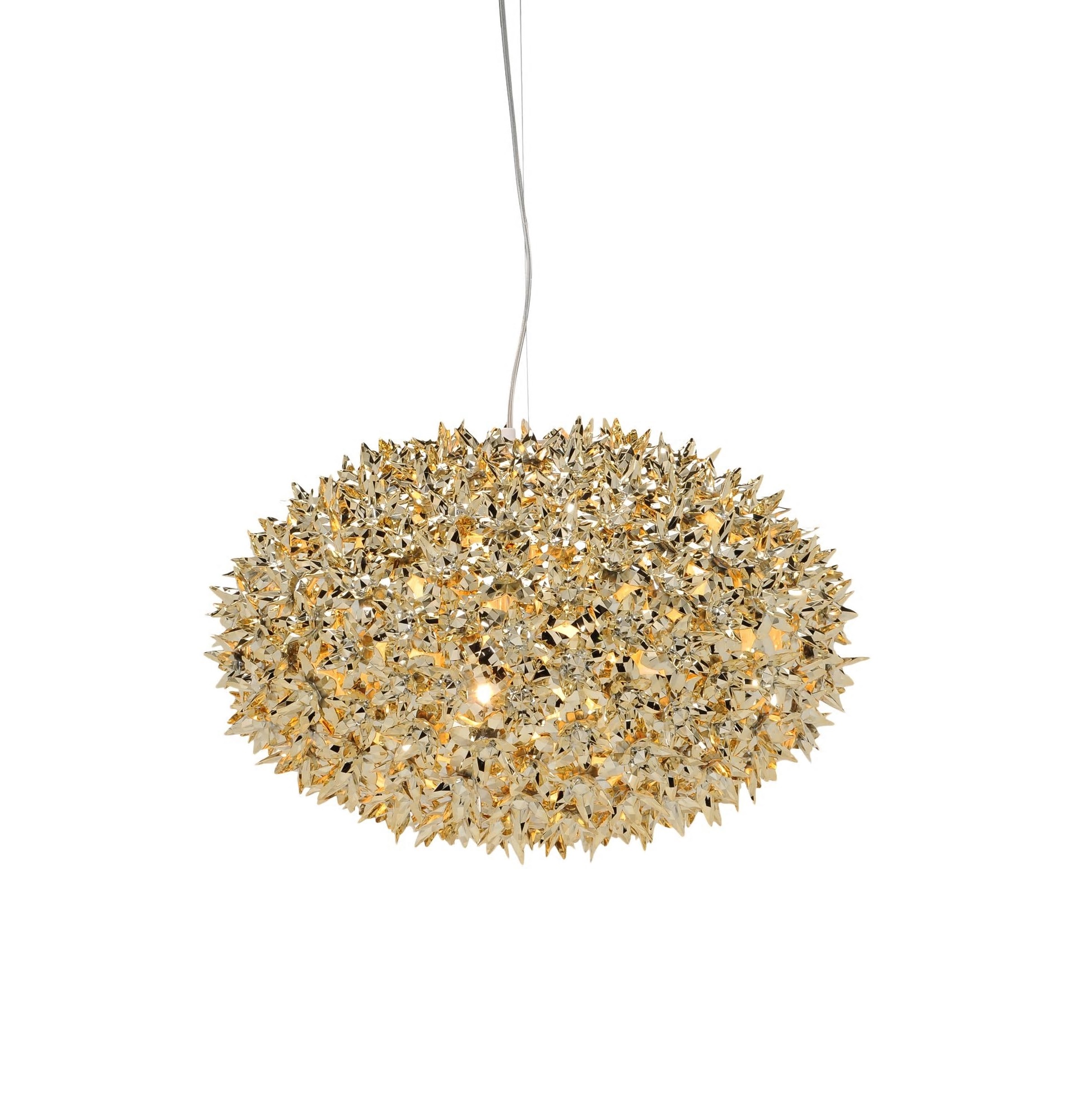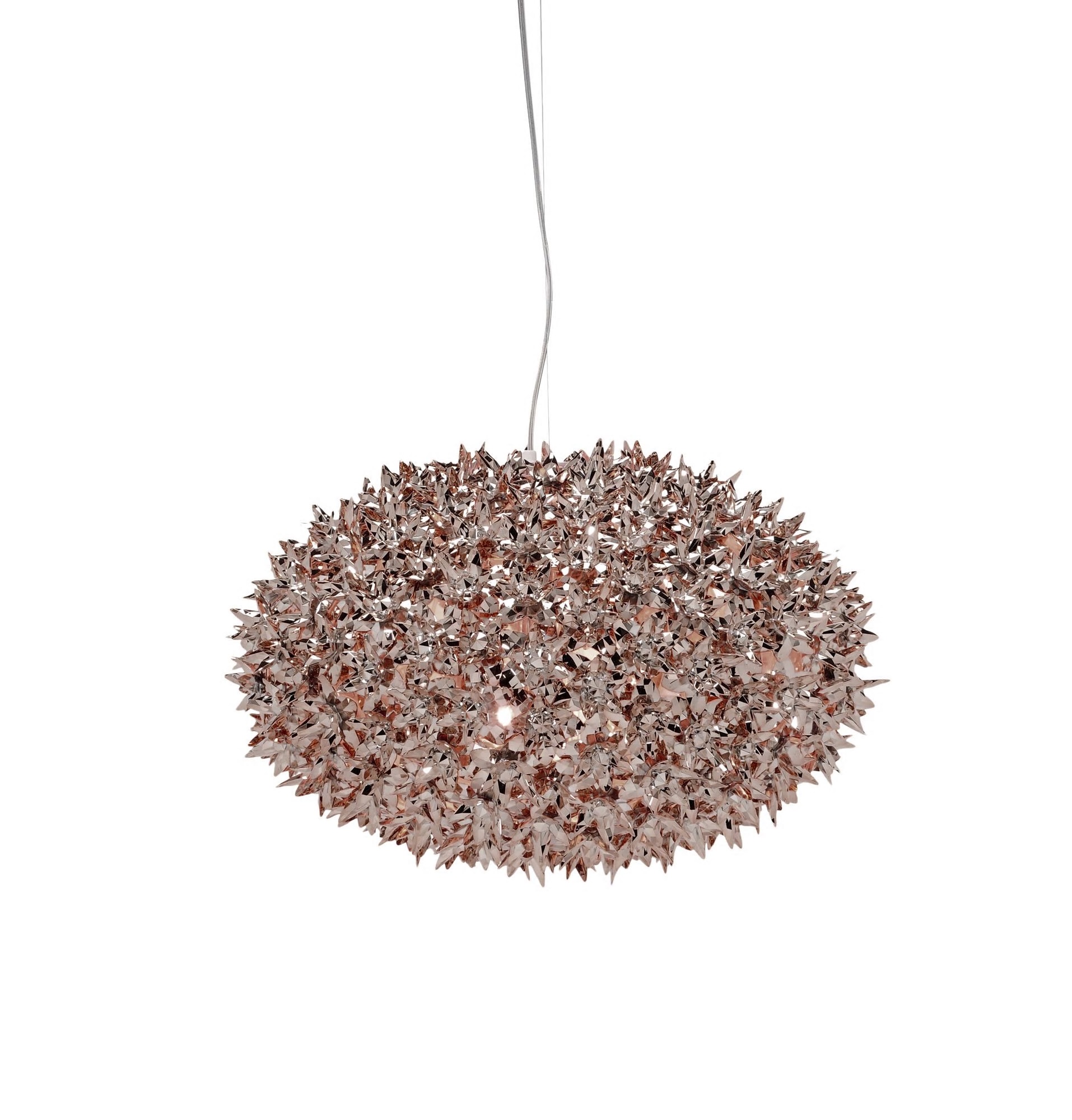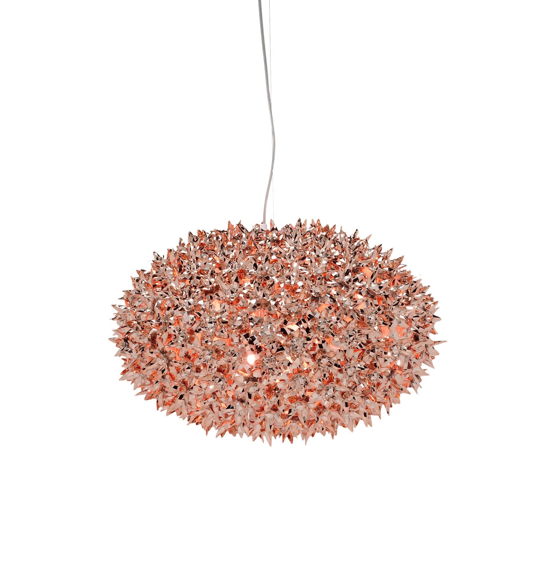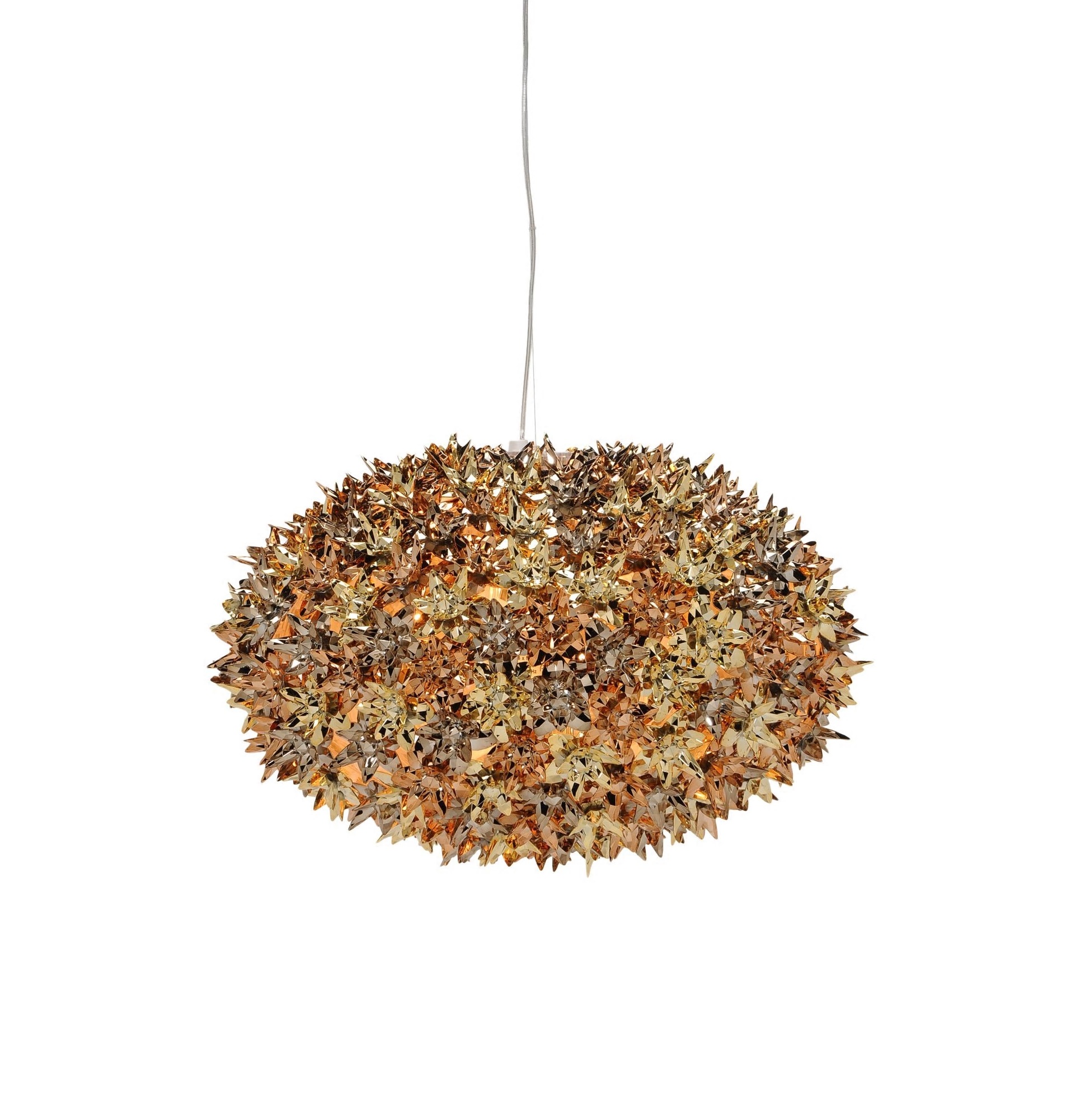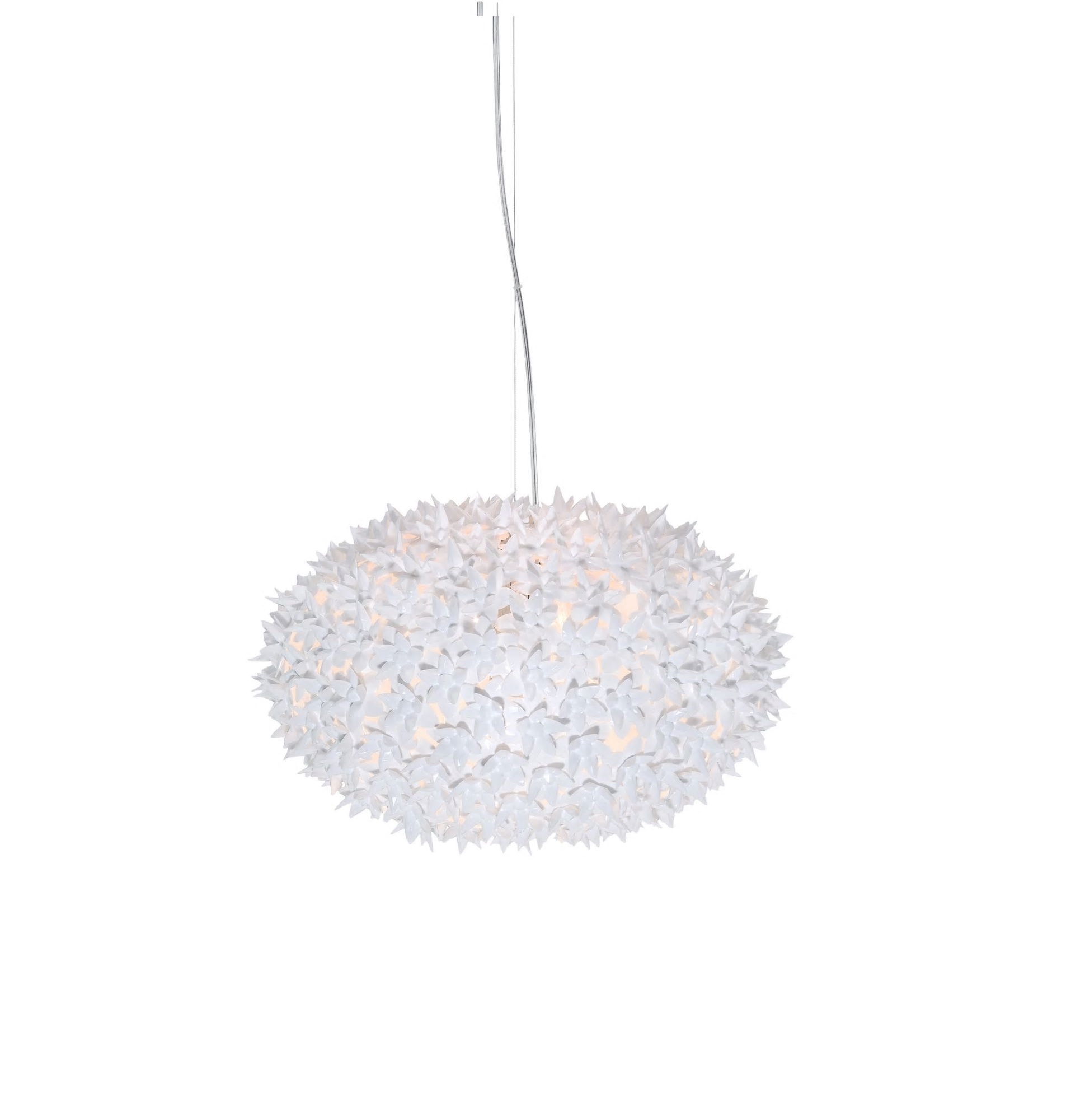 Bloom se compone de un esqueleto tubular de policarbonato, recubierto completamente con una estructura de pequeñas flores de doble corola. El resultado es una lámpara de producción industrial, pero con las formas y la complejidad estilística de un objeto artesanal de una pieza. Una serie de bombillas colocadas sobre el esqueleto interno difuminan el haz luminoso a través de los pétalos, que hacen que la luz se refracte sobre las superficies cortadas de los pétalos y que se difundan mil reflejos.