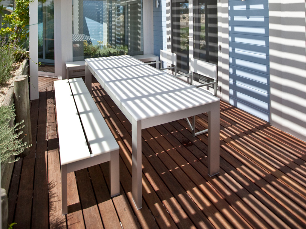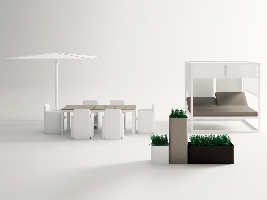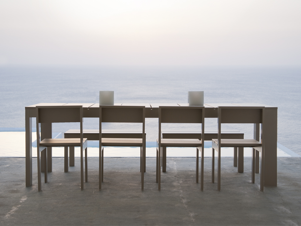 No es tan sólo una mesa de exterior, la elegancia y el estilo depurado de sus líneas la convierten en la extensión natural de cualquier espacio de exterior o de interior, de pequeños jardines, o bares, hoteles o grandes instalaciones de contract.