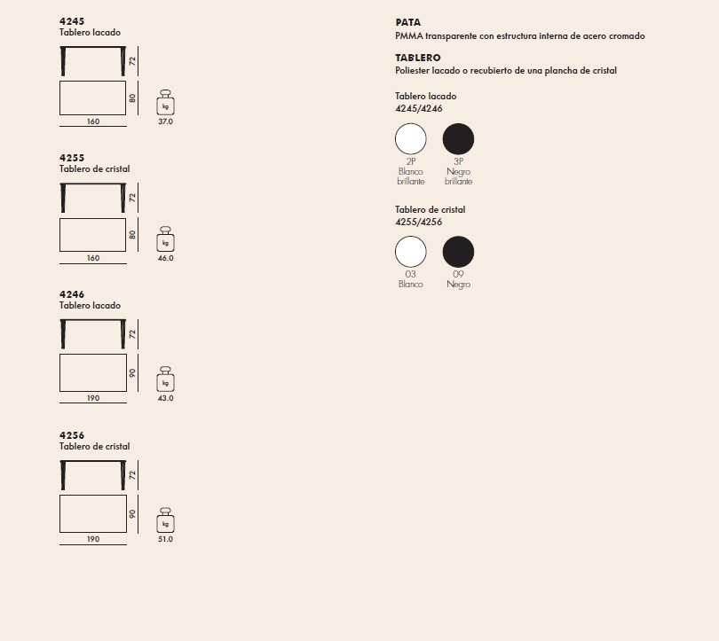 Mesa de comedor con patas en PMMA transparente y sobre en poliéster lacado disponible en diferentes medidas
