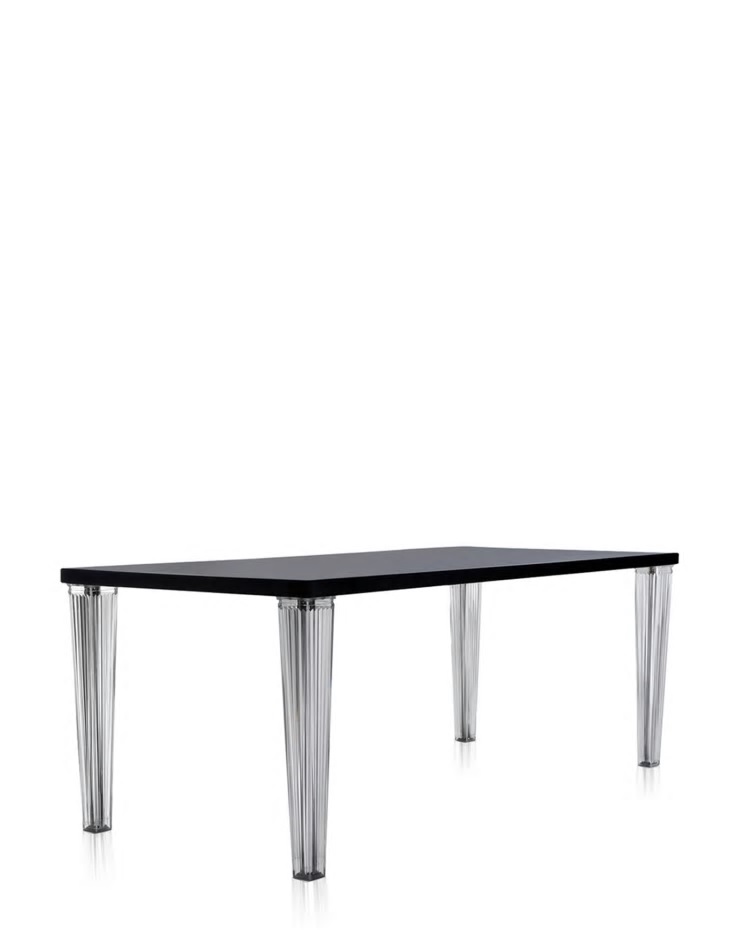La versión mesa de comedor de Top Top combina con originalidad una superficie lúcida con una transparente. La línea es mínima y elegante, pero está enriquecida por las patas plisadas transparentes de sección cuadrada que encierran la parte interior de metal. Las distintas dimensiones (está de hecho disponible con el tablero cuadrado y rectangular) y la variedad de los materiales presentes en la gama la hacen muy versátil e idónea para las diferentes exigencias de uso. Para completar y enriquecer la línea, hay disponible una variante con el tablero en una base blanca o negra.