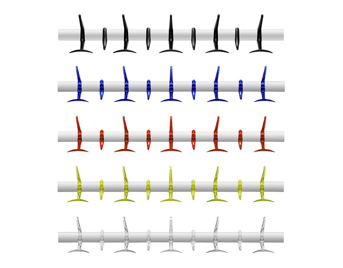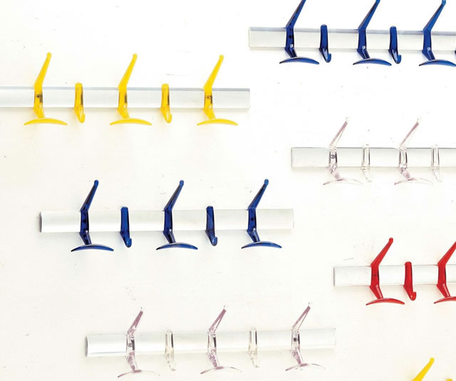 La colección de percheros Hanger armoniza elegancia y funcionalidad con acierto, gracias a la refinada combinación de los colores y acabados, y al proyecto formal adoptado. Disponible en la versión de pie y en la de barra de 60 y 90 cm, está dotado de colgadores móviles que aseguran un uso más práctico. Los anillos están realizados en aluminio brillante fundido a presión. Los colgadores son de policarbonato transparente y están disponibles en los colores cristal, rojo anaranjado, cobalto y amarillo cedro. Son de policarbonato opaco para el negro. La versión en barra permite componer una fila todo lo larga que se desee instalando varios seguidos.