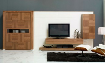 Vitrina 4 puertas y 1 puertas cristal parsol horizontal. Acabado en chapas naturales, lacas mate y lacas alto brillo. Posibilidad de aplicar acabado marquetería para la chapa natural nogal.